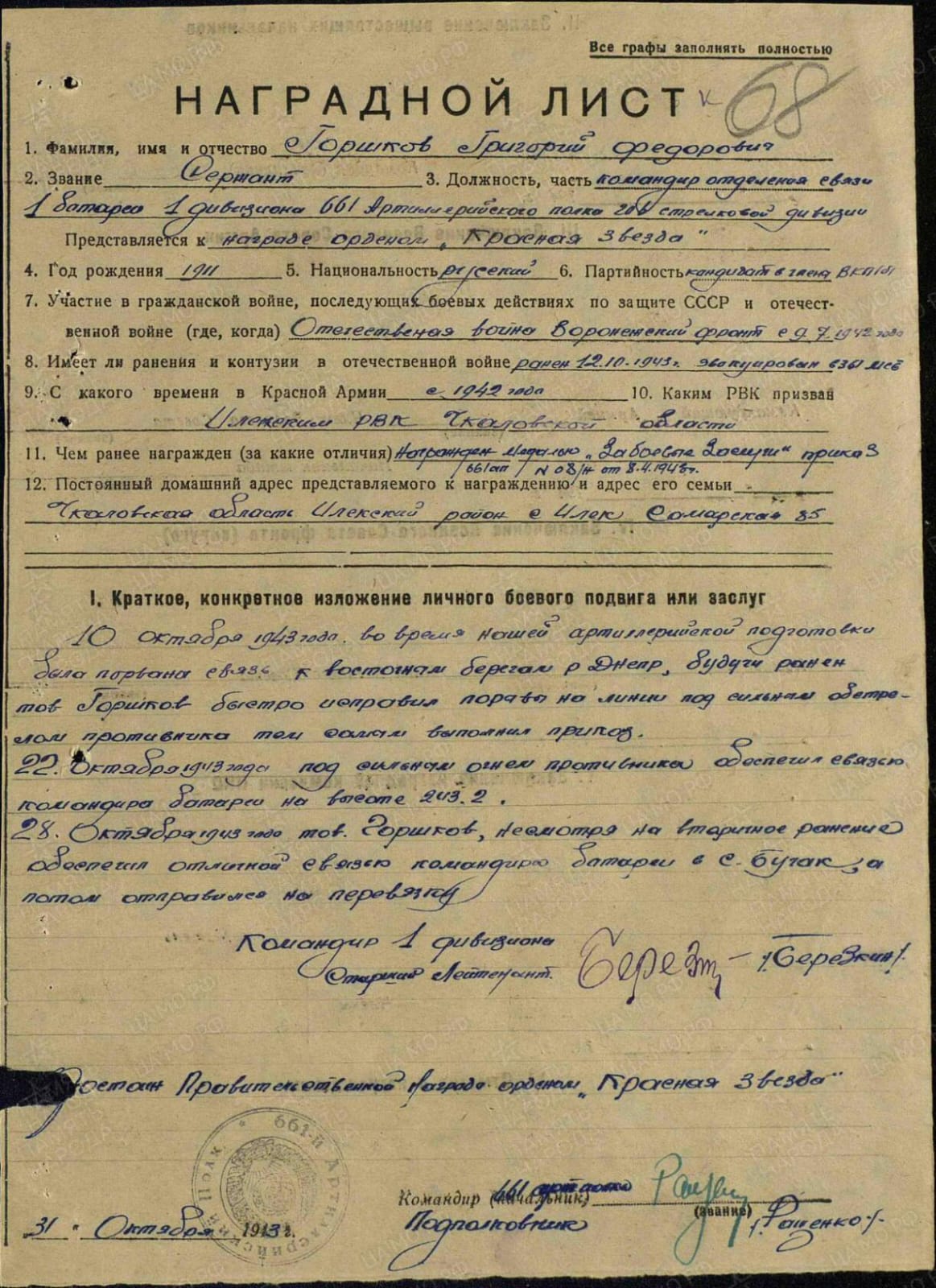 | Кавалер ордена Красной Звезды Горшков Г.Ф. | версия для печати |